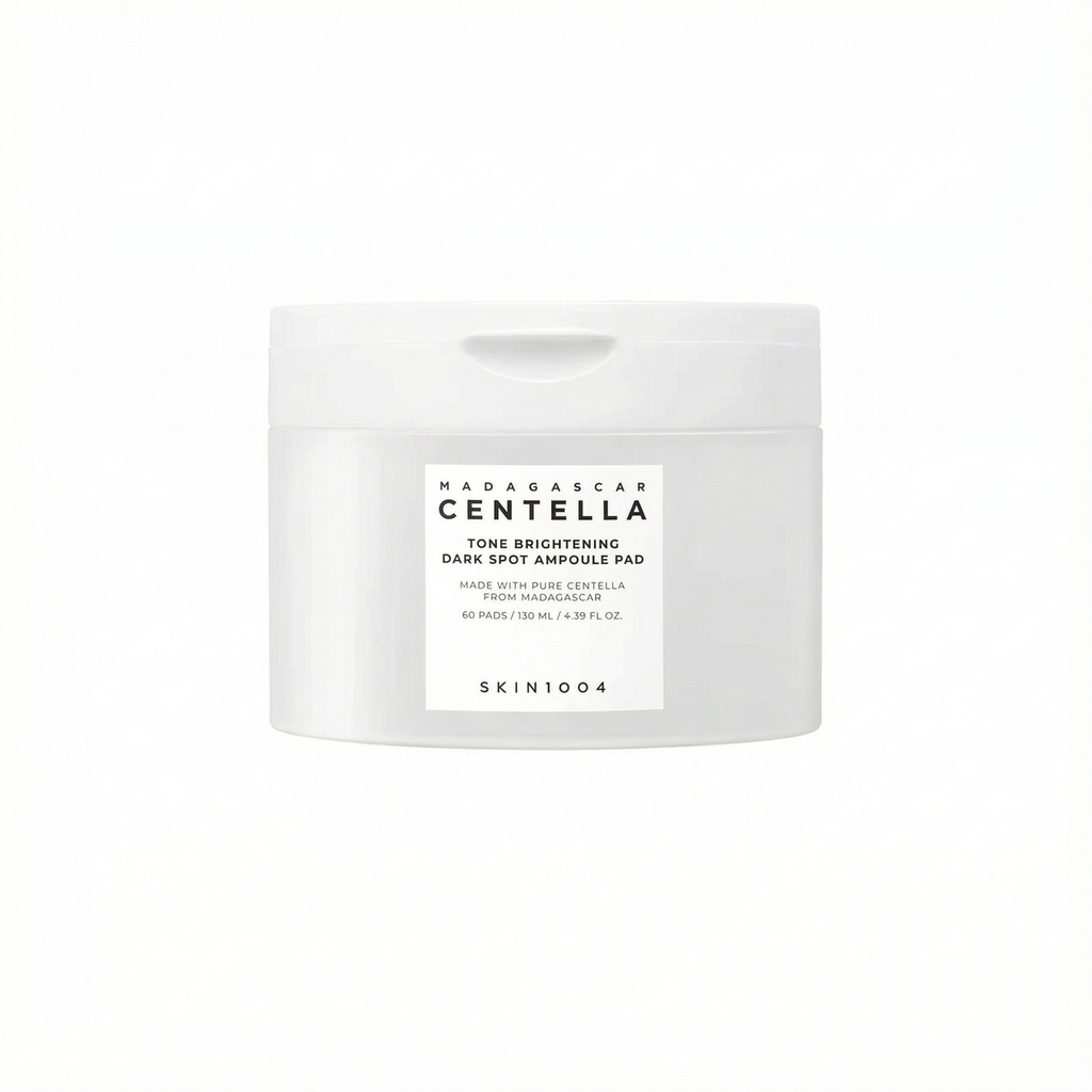 SKIN1004 Madagascar Centella Tone Brightening Dark Spot Ampoule Pads are soaked in a powerful brightening formula featuring Vitamin C Complex, Kojic Acid, and Glutathione to target dark spots and reveal radiant, luminous skin instantly. These pads target melanin, the main cause of dark spots, to diminish blemishes and freckles while promoting a clearer, more even complexion. Enriched with Madecassoside and MadeWhite™ from Madagascan Centella, they offer gentle care suitable for sensitive skin. The dual-textured pads exfoliate dead skin and deliver a concentrated blend of 5% niacinamide, Vitamin C, glutathione, and ferulic acid for brighter, smoother skin without stickiness.