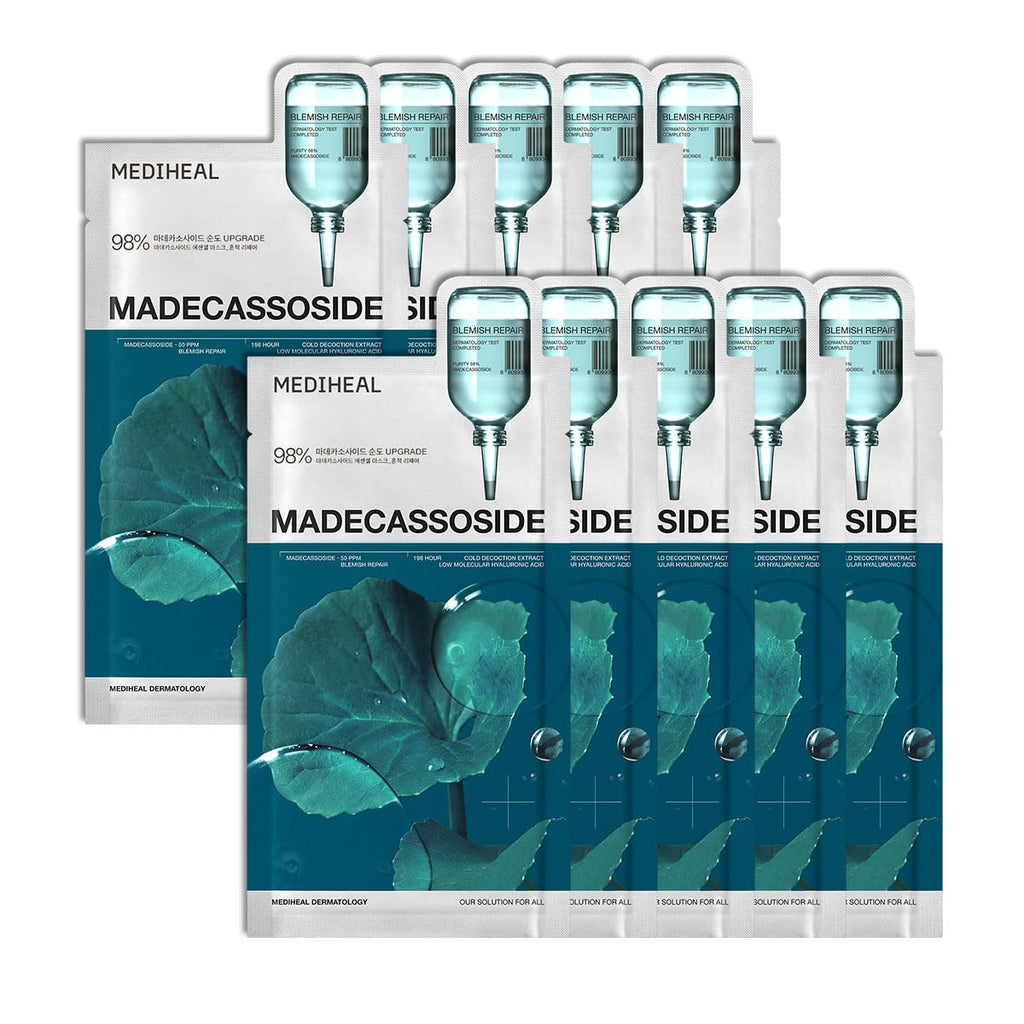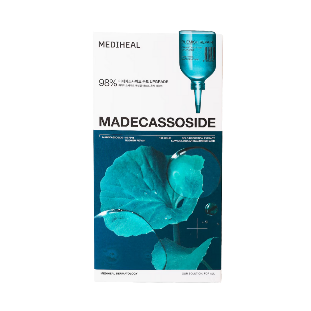 MEDIHEAL Madecassoside Essential Mask is a soothing sheet mask for recurring blemishes and weakened skin. The essence floods skin with hydration while helping fade dark spots and post-blemish marks. Liposome delivery supports fast absorption and deeper calming care. With a more refined filtration process and liposome delivery, this sheet mask has a deeper calming effect and higher purity of madecassoside.