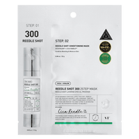 VT Reedle Shot 300 2-step Mask is formulated with soothing CICA ingredients in addition to Reedle Shot 300 Essence, which is made with 237,500 CICA Reedles that are 14x smaller than the size of the pores to stimulate the skin, improve texture and refine pore size. The second step is a (vegan) sheet mask that delivers soothing and moisturizing benefits deep into the skin.