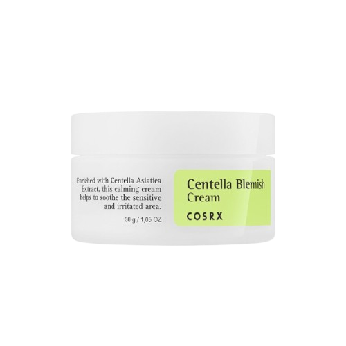 COSRX Centella Blemish Cream soothes sensitive and irritated skin and calms inflammation. When used regularly, it helps to prevent dark acne scars and redness left behind from acne. Centella asiatica leaf water and zinc oxide combine to soothe and treat troubled skin. This hydrating cream reduces inflammation inside the pores.