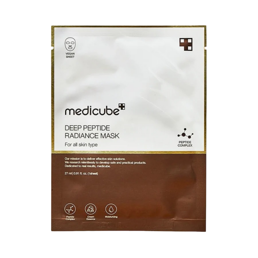 Medicube Deep Peptide Radiance Mask features high-functioning peptide cream essence packed in one effective sheet mask. It is formulated with Quadruple Peptide & Hyaluronic acid to help boost hydration and elasticity for gleaming skin. Experience wrinkle, elasticity and moisture improvement effect with just one sheet.