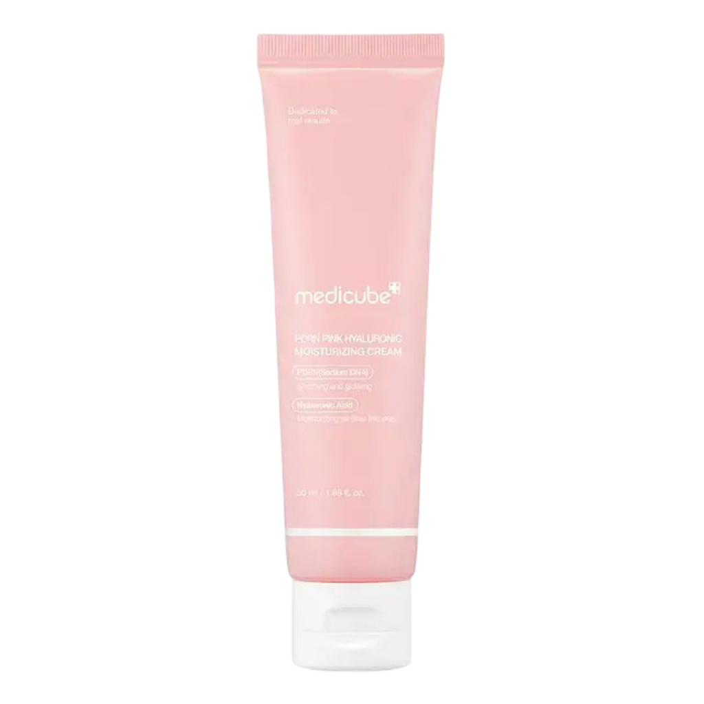 Medicube PDRN Pink Hyaluronic Moisturizing Cream hydrates deeply into the skin by protecting the skin barrier and boosting skin elasticity while enhancing skin glow. It helps support uneven skin tone with vegan salmon PDRN and hyaluronic acid. Salmon PDRN helps support uneven skin tone for clear complexion and hyaluronic acid boosts hydration for soothing and glowing. It has a mild watery texture without stickiness but will lock hydration and quench skin thirst quickly