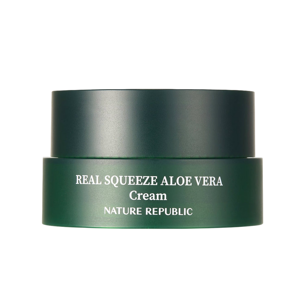 NATURE REPUBLIC Real Squeeze Aloe Vera Cream is a moisturizing gel-type cream that boosts hydration and gives skin a supple texture after use. It is formulated with California-grown aloe vera as well as fruit wine extract to soothe, hydrate and nourish skin.