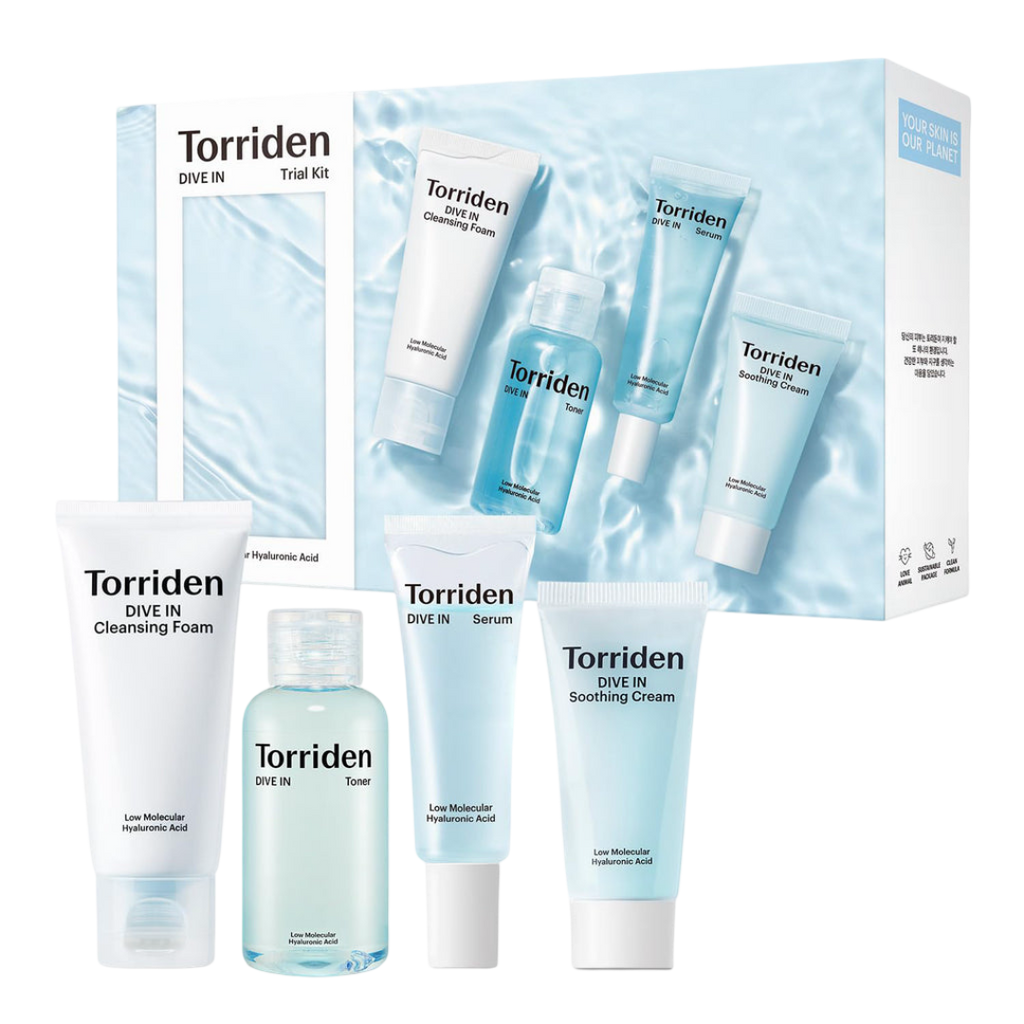 TORRIDEN Dive-In Trial Kit is the perfect way to dive in and experience this hydrating skincare line! Included in this set is a simple 4 step skincare routine that targets dehydrated and sensitive skin. Each product features low molecular hyaluronic acid to deeply penetrate pores and hydrate from within. It can be used for any skin type that feels dehydrated, including oily skin.