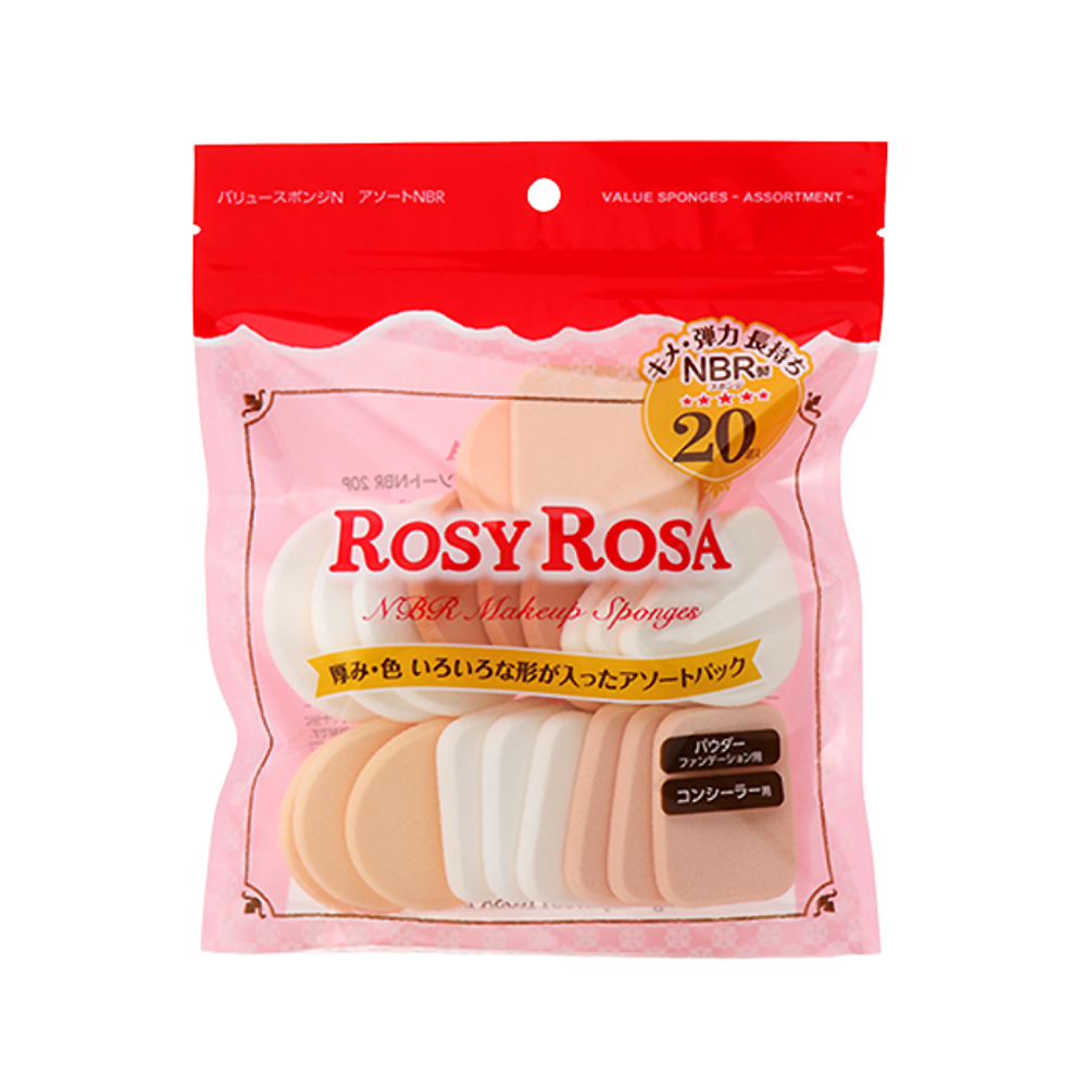ROSY ROSA Value Sponge -  N Assorted NBR is a pack of assorted makeup sponges, made of NBR to be durable, long-lasting, and are smooth to the touch. These are more durable and stay firm even after washing! They come in an assortment pack with a wide variety of shapes, thicknesses, and colors